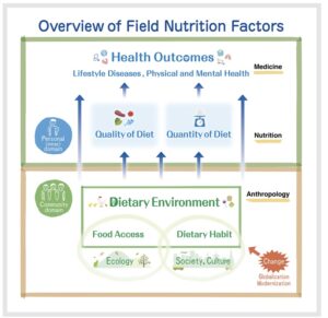 Eating is not just about the intake of essential nutrients but is deeply connected to the environmental factors (natural and social environments) and cultural background that form the foundation of dietary habits. In Field Nutrition, we analyze the relationship between food and health through Epidemiological studies and explore the underlying factors of dietary behaviors through fieldwork. By conducting comparative research in several regions in Asian countries, we aim to understand the local characteristics in the relationship between diet and health and address health issues through region-specific approaches.
